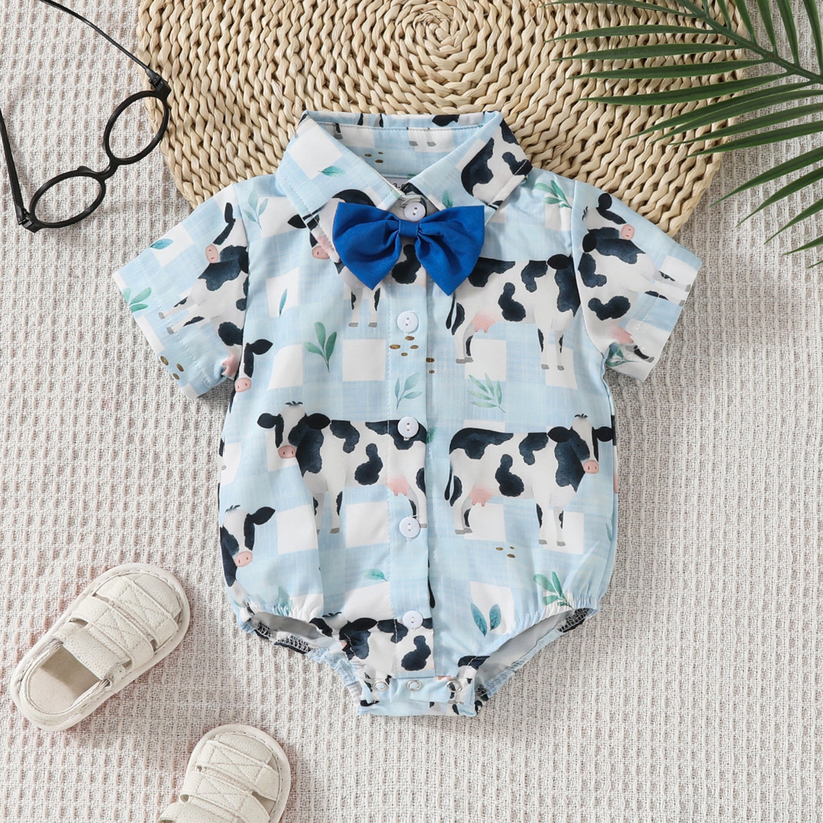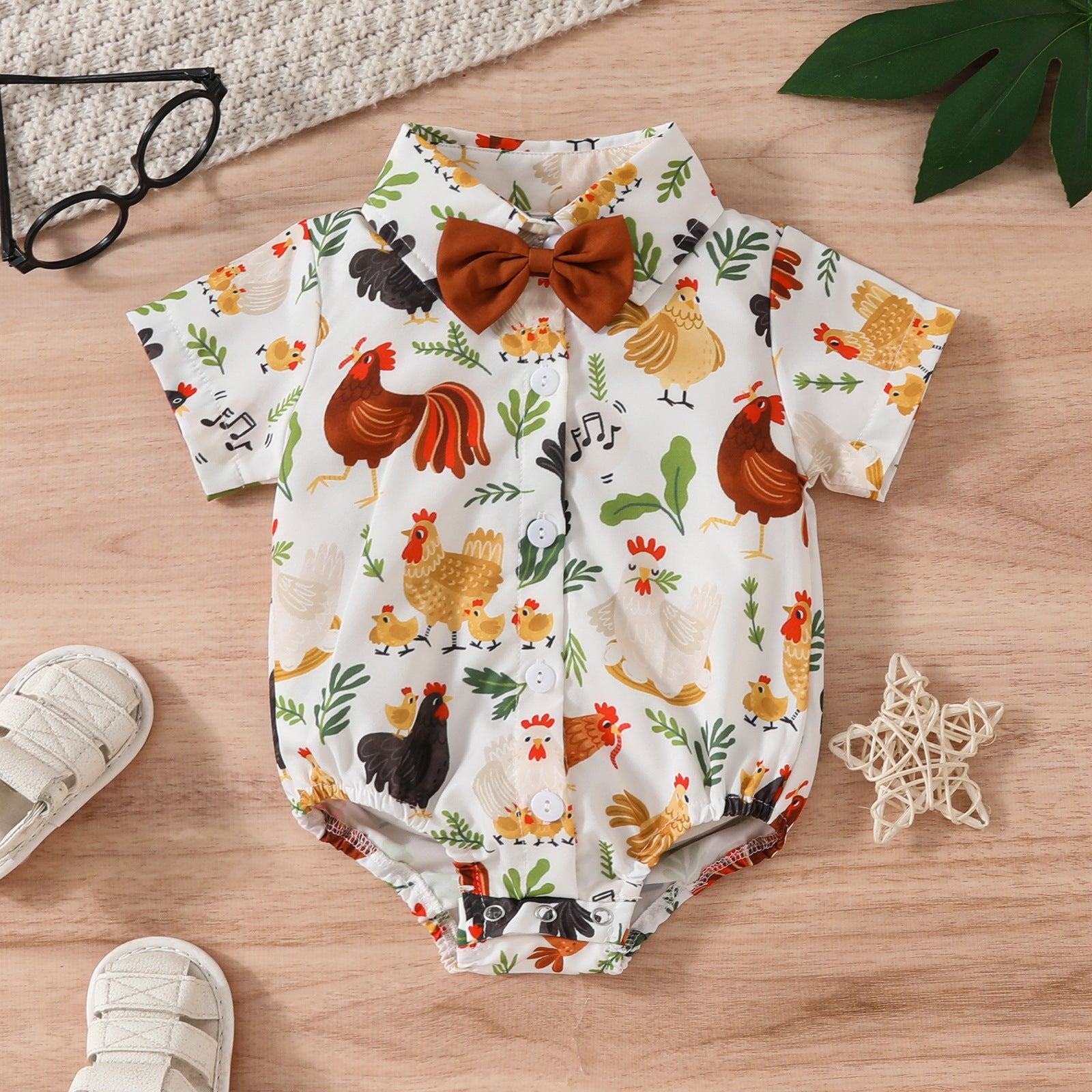 Printed Short Sleeve Lapel Bow Shirt Jumpsuit